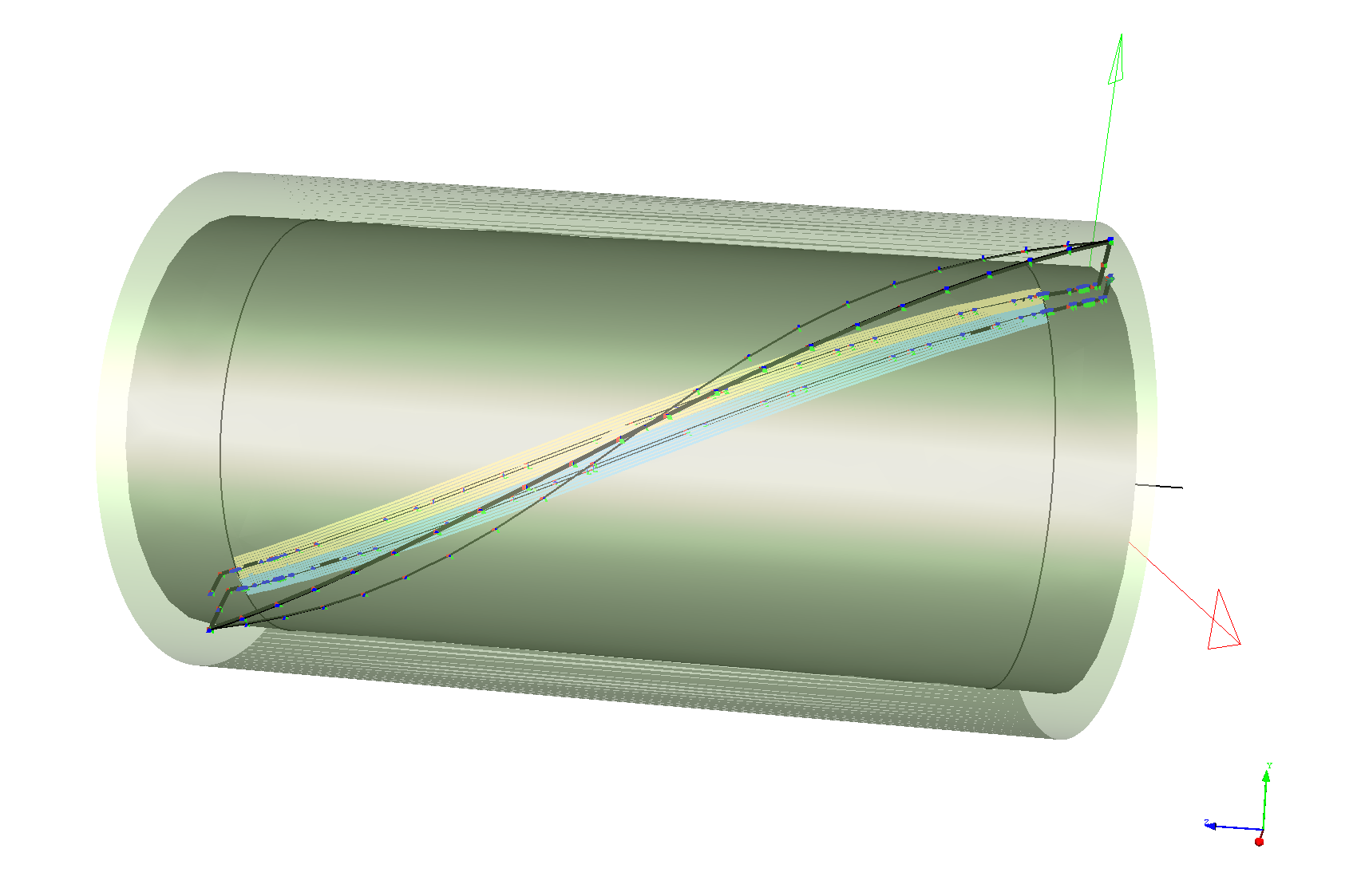 在计算相邻的铺层的连接路径的时候,增加一种投影到包络面的算法。其实这个想法很久之间便有了,当时只是实现了投影到原本的铺放表面,然后再沿着法向量进行偏移,但是法向对于一些稍微复杂一点的曲面,效果不好,投影的路径经常有一半在上面,一半突然到下面。这个原因是当要投影的直线穿过中心点附近时,到上下两面的距离几乎相等,所以投影后的点会跳跃,造成投影曲线不连续。实际上如果包络面是严格的圆柱面,这种情况很少会出现,因为被投影直线要正好穿过圆柱的中心线,这个在浮点数的世界是很难精确表达的。